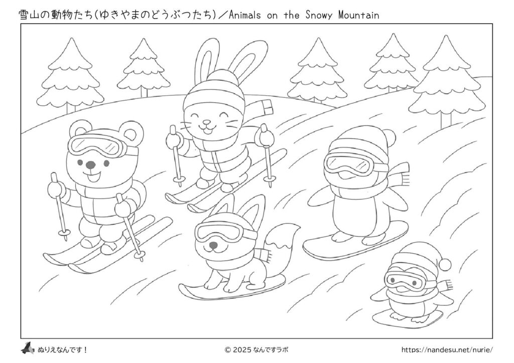 冬季オリンピック競技のボブスレーをイメージしたぬりえです。スピード感あふれるコースを滑り降りる様子を、かわいいキャラクターで表現しています。冬のスポーツの迫力と楽しさを感じながら塗れる一枚です。