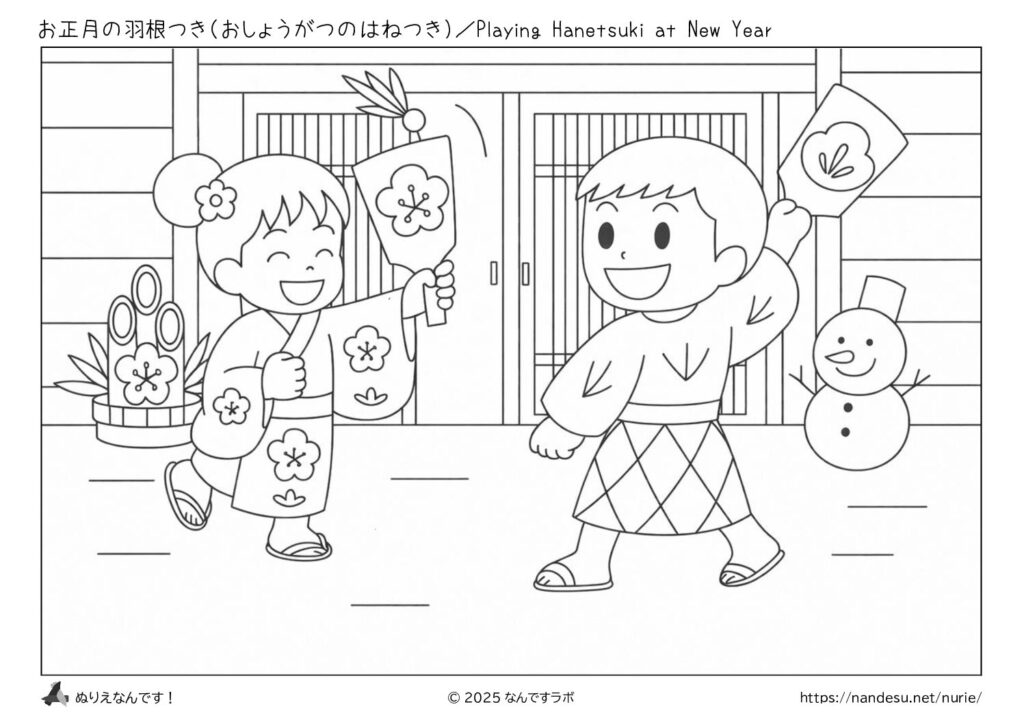 お正月の定番あそび「羽根つき」を楽しむ子どもたちを描いた、にぎやかで親しみやすいぬりえです。和服や羽子板、門松などのお正月モチーフがそろっており、小学生低学年でも塗りやすいシンプルな線で、季節行事を楽しく感じられます。