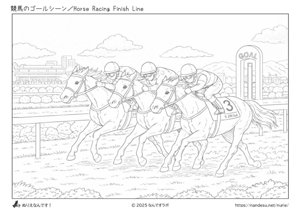 ゴールを目指して並走する競走馬と騎手たちを描いた、迫力ある競馬のゴールシーンのぬりえです。筋肉の動きやスピード感のある構図で、塗りごたえもたっぷり。馬やスポーツが好きな方、大人向けの本格的なぬりえを楽しみたい方におすすめです。
